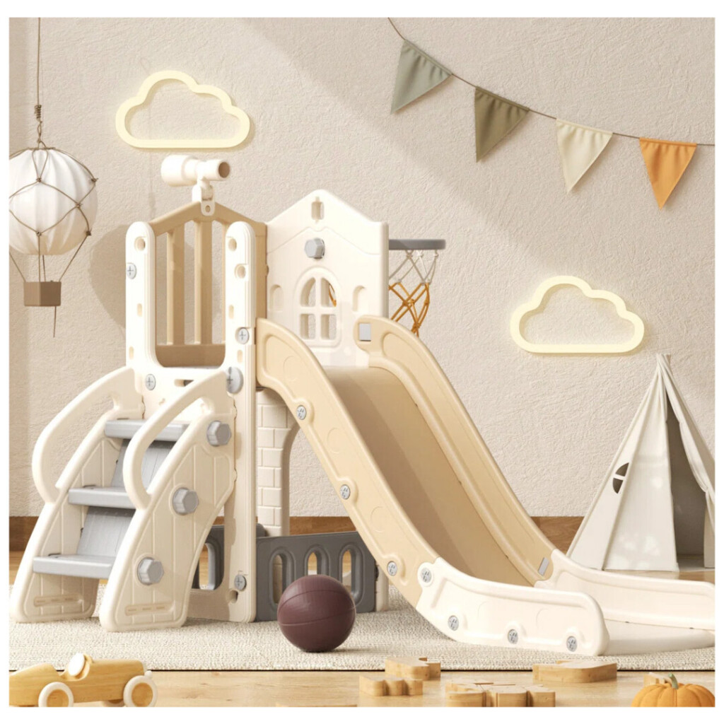 This set has a slide and a basketball hoop!
